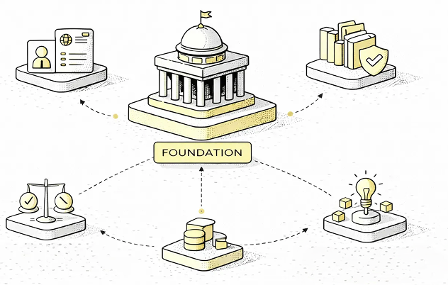 The Foundation oversees governance administration, issuer eligibility standards, registry maintenance, and accountability processes at the Layer-0 level. It does not operate markets or control transaction settlement.